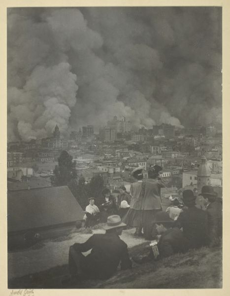 Editor: So, this is J. Nolte's gelatin silver print, "Rookwolken boven Rotterdam, gezien vanaf de Mathenesserlaan," or "Smoke Clouds over Rotterdam, seen from Mathenesserlaan," made sometime between 1940 and 1945. It’s overwhelmingly bleak, a city consumed by smoke. What strikes you most about it? Curator: You know, that smoke, that dreadful billowing… it's almost beautiful, in a terrible, tragic way. It dominates the frame, like a perverse halo over Rotterdam. The photo feels… stolen, almost, a quick, desperate grab at a reality no one wanted to see. It's the anti-postcard. Editor: I see what you mean about the "anti-postcard" feel. What do you make of the people gathered in the foreground? Curator: Ah, the watchers. That’s where the gut punch lives. Are they grieving? Numb? A little of both, maybe. Imagine the smell, the heat… it’s a shared trauma made horrifically public. They're small figures against this monumental destruction, lending the scene a solemn grandeur, don’t you think? Editor: Grandeur is a strong word for something so destructive! But I do get the contrast you're pointing out between the individual and the event. Curator: Maybe grandeur is too…clean. It's a dirty, smoky grandeur, forged in trauma, I suppose. Photography has a certain way of rendering devastation strangely compelling. It offers us a mediated distance, safe, and yet immediate, don’t you find? Editor: Definitely, I see that now! It’s easy to forget the sheer scale of events like these and I feel this photograph provides an invitation to look closer and consider this scene in relation to the personal cost of war. Thanks! Curator: Indeed. And isn't it astonishing how a simple gelatin silver print can unlock such layered histories? These unassuming photographs serve as echoes of humanity in extremis. A sobering image, and utterly unforgettable.