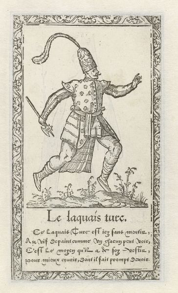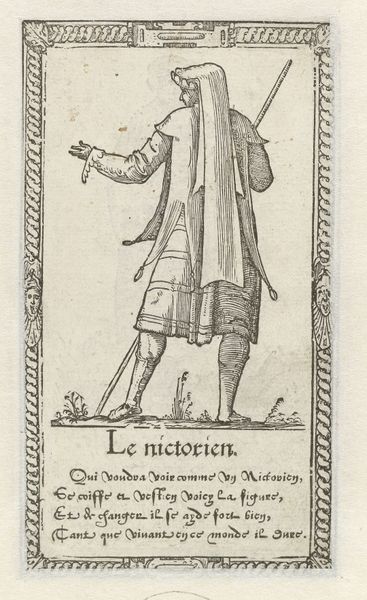 This woodcut print, "Man in klederdracht met mantel en staf," was made by François Desprez sometime in the 16th century. The image is composed of strong black lines carved into a block of wood, which would have been created using chisels and gouges. The material of the woodblock itself is critical to understanding the final product. Woodcuts like this were a relatively inexpensive way to disseminate images and texts widely. The depicted figure, in a full-coverage cloak and hood, with pine cone staff, speaks to a European fascination with the exotic, and a desire to categorize different cultures and peoples. The work involved in carving the block, while significant, was ultimately a means to mass production. This print exemplifies how the material and mode of production directly influenced the artwork’s accessibility and its role in shaping social perceptions. It prompts us to consider the relationship between labor, representation, and the circulation of ideas in the early modern period, beyond traditional art historical concerns of style and authorship.