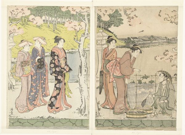 Editor: Here we have Chōbunsai Eishi's woodblock print, "Parody of the Well Curb Story from the Tales of Ise," created sometime between 1789 and 1801. It strikes me as incredibly serene, a tableau of women in a garden. What do you see in this piece, looking beyond the immediate beauty? Curator: I see a layering of cultural memory encoded within a seemingly simple genre scene. Consider the well itself. The well curb acts as a threshold. Wells were sites of community gathering and storytelling. To see these fashionable women gathered at one suggests not only leisure but perhaps also a subtle commentary on the shifting social dynamics of the Edo period. Editor: Shifting how? Curator: Notice their elegant clothing, their refined hairstyles. Eishi was known for depicting the beauties of the pleasure districts. By placing them in this garden setting referencing the 'Tales of Ise,' a classic work of Heian-era literature, he is playing with ideas of aspiration and access. It invites reflection on how cultural touchstones get reinterpreted and repurposed across social strata. Editor: So the parody isn't just a joke, but a way of questioning the original story’s meaning? Curator: Precisely. Symbols accrue meaning over time, and their presence here is not accidental. Even the cherry blossoms overhead carry connotations of fleeting beauty and mortality, a gentle reminder interwoven into the scene of everyday life. Can you sense that echo now? Editor: Yes, it’s almost like the scene is holding multiple stories at once: the original tale, the life of the women, and Eishi’s commentary on it all. Curator: Indeed. Woodblock prints such as this serve as time capsules, holding layers of cultural understanding for us to unpack. Each element is chosen to contribute to this experience of discovery. Editor: I'll definitely look at ukiyo-e with fresh eyes now. There's so much more than what's immediately visible!