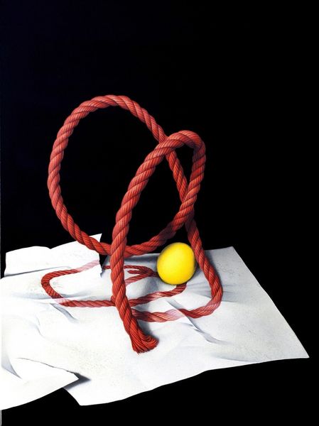 Editor: So, this is "Rope and Chain," a 2018 painting by Eckart Hahn. The contrasting textures of the smooth, cold metal and the tightly wound, warm-colored rope create such a stark visual tension. How do you interpret this piece? Curator: I see layers of symbolic contrast playing out before us. Chains, historically, represent restriction, burden, even bondage. Yet, the binding with rope introduces a fascinating element. Rope speaks to connection, nautical history, even lifeline imagery. Do you notice the color choice? Editor: I do. The rope’s vibrant red seems to jump out against the muted tones of the chain. Curator: Exactly. Red is primal. Blood, passion, danger. But binding something harsh with something so vibrantly alive... isn't it thought-provoking? Perhaps the artist hints at tempering severity with warmth, connecting restriction to raw emotion. Or could it signal something darker – the binding of anger or violence? What textures stay with you? Editor: The texture of the chain does seem quite stone-like. What does that imply? Curator: Stone brings longevity and endurance to mind. Unlike the comparatively disposable rope, it appears as a lasting structure being interwoven. Perhaps there is continuity here as well. Does that change anything for you? Editor: Definitely! The work feels less about pure opposition now and more about… layers of meaning building upon each other. Restriction and release, ancient and modern, dangerous passions that nevertheless strengthen a vital core... Curator: Yes, and these intertwined elements remind us that symbols are rarely simple; they echo through culture and experience, colored by our own perceptions. Editor: It's really fascinating to see how everyday objects can be imbued with such rich layers of symbolism. I’ll never look at a chain the same way!