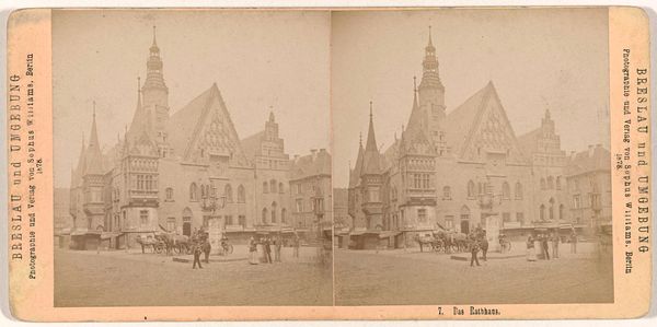 Editor: Here we have Hermann Selle’s "Stadhuis en de Sint-Benedictuskerk, Quedlinburg," a photographic print created sometime between 1868 and 1890. It depicts a rather serene-looking town square. The architecture is the star, of course, but there is an incredible sense of stillness, almost like a freeze-frame in time. What strikes you when you look at it? Curator: Well, firstly, let's not overlook the technical side! The fact this is a stereoscopic photograph intended for viewing with a special device is something that perhaps eludes us now. So, that stillness you mentioned? It's a constructed illusion designed to transport the viewer. It wants to swallow you into that moment! Do you feel it succeeded, in some respect? Editor: Absolutely! Despite the somewhat faded tones of the print, I can almost hear the quiet hum of daily life happening there. You mentioned the stereoscopic effect – does that play into the composition at all? The positioning of the buildings, or the figures in the square? Curator: Intriguing question! I wonder if Selle wasn't intentionally playing with depth. The buildings act as anchoring points, almost like theatrical flats, guiding the viewer’s eye deeper into the constructed reality. And observe how figures are strategically positioned – little stage actors in a carefully considered production. And isn't it beautiful, in a way, that something seemingly objective like a photograph could be this manufactured experience? Editor: That’s such a fascinating point! I was so focused on the aesthetic qualities, I hadn't fully considered the active construction of the image itself. Now, I want to hunt down a stereoscope and really *see* what Selle wanted us to experience. Curator: Exactly! These old photos… they're little portals. We need to do our bit to pry them open.