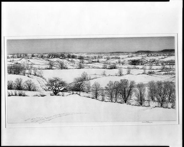 Editor: Okay, so we’re looking at M.C. Escher’s "Snow" from 1936, a pencil and graphite drawing that, honestly, feels pretty stark. It’s monochrome, all these hard lines depicting a building buried under snow. I can almost feel the cold! What do you make of it? Curator: Cold, yes, but also consider the odd warmth tucked inside those geometric angles, no? Escher was fascinated by tessellations, by structures fitting into one another, even as winter's isolating hand sweeps across the landscape. Look how those power lines hum against the snowy mountains... a visual poem, perhaps, about man versus nature... or is it nature accommodating man? What feelings bubble up as you stare? Editor: I suppose there is that weird juxtaposition. Civilization plunked right down in the middle of nowhere...it gives the piece an interesting tension. The solid blacks against the vast whites create contrast and interest too. But it’s hard for me to feel like this conveys warmth – it feels lonely. Curator: Lonely, you say? Good. Perhaps Escher felt a similar sense of removal. Isn't that telephone pole reaching towards something—connection maybe?— while simultaneously anchoring the dwelling to its isolated reality? It feels a little like a haiku written with graphite, doesn't it? Brief, intense, evocative. Does the foreground make you feel isolated too? Editor: Yes, seeing the details like the textures of the dried weeds almost makes the landscape more personal... less about 'man versus nature,' more like one man's winter. Curator: Exactly! You have to almost breathe it to truly see its beating heart. I always appreciate discovering new perspectives. Editor: Me too. It really highlights how complex even seemingly simple art can be.