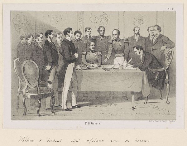 Editor: This is "Samuel Rogers at his Breakfast Table," an engraving by Charles Mottram after John Doyle. It feels like a gathering of important figures. What symbols stand out to you in this image? Curator: The table, laden with breakfast, becomes a symbol of shared ritual and intimacy, doesn't it? Notice how the men are arranged, some engaged in conversation, others contemplating the art on the walls. Each portrait adds another layer to the narrative, suggesting lineage, influence, and the weight of cultural memory. Editor: So the art *in* the art becomes part of the story? Curator: Precisely! These aren't just decorations; they are symbolic stand-ins for their own histories, contributing to Samuel Rogers’ identity. What do you make of the men examining the art to the right? Editor: It emphasizes the importance of art within their social circle. I see how each detail contributes to the overall meaning. Curator: And the way Doyle arranges them, capturing not just likenesses but also something of their inner lives. Food for thought, indeed. Editor: This has given me a completely new way to look at it. Thanks!