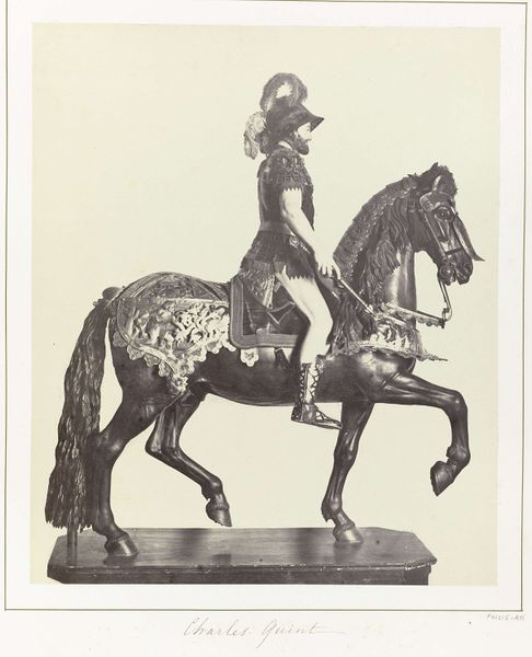 Editor: This print, "Heilige Joris te paard" by Henri-Charles Guérard, created in 1897, depicts Saint George on horseback. It's interesting to see this medieval theme interpreted using engraving and graphite. I am struck by how realistic the knight’s armour looks, in contrast with the otherwise fairly loose lines and minimal background detail. What draws your eye to this particular work? Curator: I immediately consider the materiality of this print, its creation through engraving and graphite. Think about the labor involved. Each line etched, each shadow built meticulously. This wasn’t simply an artistic vision realized, but a careful, controlled process. How does that manual process inform our understanding of the 'medieval' theme itself? Editor: Well, perhaps the level of detail mirrors that which would have been required of craftsmen creating actual armour. Does it suggest anything about how artists viewed labor differently then? Curator: Exactly! This challenges our traditional understanding of “fine art” by highlighting its links to craft production. Look at how the different materials allow the artist to explore textures – the smooth armour, the rough horsehair. These are everyday materials transformed through labor and skill. Do you notice how this reproduction almost democratises access to an image of this cultural icon? Editor: Yes, the fact that it is reproducible definitely creates wider access to it than say, an oil painting might have offered at the time. The work becomes part of a different, broader system of value then. Curator: Precisely. It reframes the creation of ‘art’ as fundamentally entwined with social and economic contexts of production, consumption, and accessibility. Editor: I hadn't thought about it that way, seeing the connection between the physical labor and its place in a wider community of viewers. Thank you for illuminating those elements. Curator: And thank you. It's always a refreshing to find new angles to look at art!