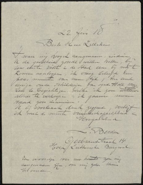 Curator: Here we have "Brief aan jonkheer Hendrik Teding van Berkhout," which translates to "Letter to Esquire Hendrik Teding van Berkhout." Penned by Frans Everbag, most likely around 1915, this letter is rendered in ink on paper. What are your initial impressions? Editor: My first thought is how incredibly intimate it feels, almost like eavesdropping. The delicate script dances across the page, a swirling symphony of black ink against the aged paper. It feels immediate, even urgent, like a whispered secret meant for only one person. Curator: I find that observation interesting, because script, historically, possesses power beyond the immediately personal; as we decode it, each word, stroke, and flourish unveils societal values. This letter isn’t simply about its literal meaning; it’s about communication within a very particular time and context. The penmanship, the choice of words, the very act of sending a letter—all resonate with cultural significance. Editor: You’re right, of course. Beyond the personal, I see the formal, almost ceremonious way he writes to someone, in graceful script, "Zeer geachte Heer." That’s “Dear Sir,” right? This kind of formal exchange seems almost unimaginable now in our rushed digital missives. It's a dance of respect. Curator: Precisely! And even the materials – the permanence of ink, the tangible quality of the paper – speaks volumes about the intention behind the message. The selection suggests the writer wants to have what he is expressing taken seriously. This contrasts our current forms of digital communications which, in their ephemeral nature, almost imply disposability. Editor: A fair point, because looking closer now I also feel a faint longing, too, perhaps for a time when handwriting revealed character in a way keyboards never could. And the slight imperfections, the tiny smudges of ink, these speak to an inherent vulnerability…It reminds me, also, that correspondence as an art form has really disappeared, in its tactile and literary value. I hadn't considered that before. Curator: It's something to remember when viewing these kinds of artifacts, yes. Each letter contains a piece of cultural history, of relationships as conducted in this time. A whole narrative exists in its strokes.