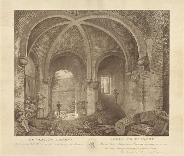 Editor: This etching, "Het onderaardsch gewelf van het kasteel Vredenburg te Utrecht," created around the early 19th century by Willem Hendrik Hoogkamer, presents the underground vault of a castle. I find its tonal variations particularly compelling, creating a somber and somewhat mysterious atmosphere. What specific elements of composition or form do you observe in this piece? Curator: The power of this piece lies precisely in that stark tonal contrast. The architectonic vault is meticulously rendered, inviting us to analyze the structural relationships. Observe the lines, the geometric progression of the arches, and how the light source impacts their form, offering a dynamic interplay of shapes. Do you find that interplay effective in conveying a sense of depth? Editor: Yes, the geometry and shadowing create an intriguing illusion of depth within the confined space. The strong horizontals and verticals against the curved arches certainly add to that sense of perspective. How do you interpret the use of the etching technique in this specific context? Curator: The etching technique enhances the architectural details, accentuating each line. This heightens our awareness of form. Think of the textural richness achieved with varied line weight. Are you beginning to appreciate how the medium enhances the message? Editor: I am. The precision afforded by the etching captures the stark reality of the vault so beautifully. The interplay between line and tone gives this space so much power. Curator: Indeed, by concentrating on these formal aspects we unlock a profound understanding of its austere yet captivating presence. Editor: Thank you. I now perceive this work through a lens of both the medium’s ability to depict structure and the dialogue between the architectural forms in space.