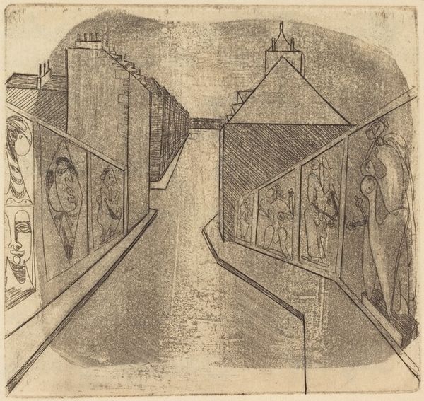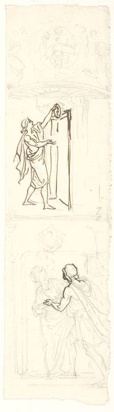 This delicate drawing of an unidentified building, ceiling or wall, and painted frieze, was created by an anonymous artist using pen and brown ink. The composition is divided into distinct architectural sections. On the left, a figure stands behind what appears to be a low wall or barrier, defined by sharp, precise lines that create rectangular spaces. To the right, the drawing transitions into a more dynamic scene of human figures interacting; their poses and gestures are rendered with fluid, sweeping lines. The contrast between the rigid architectural elements and the organic forms of the figures sets up a visual tension, prompting us to consider the relationship between structure and human activity. The empty space surrounding the figures and architectural details also plays a crucial role, emphasizing the deliberate arrangement of forms. The anonymous nature of the artist and subject invites us to focus on the formal qualities of the drawing itself. It encourages reflection on the underlying codes and conventions that shape our understanding of architectural space and human representation.