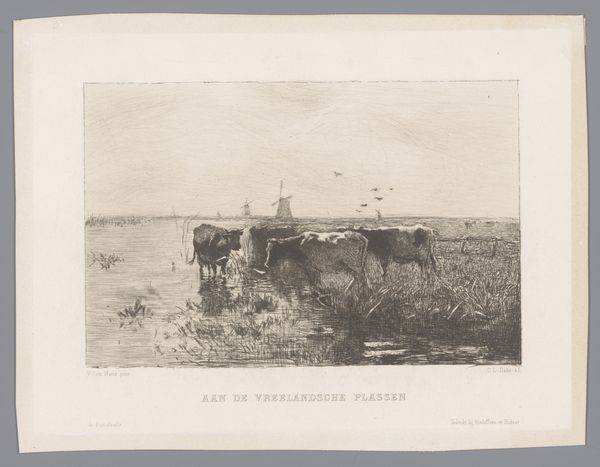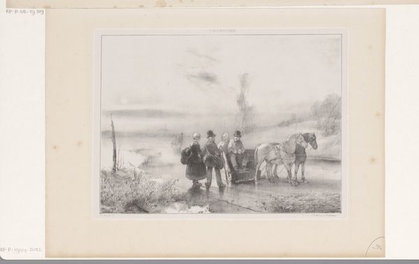 Célestin Nanteuil created this print, Verschillende mensen op een veerpont, using a subtle range of monochrome tones. The print depicts a river scene where the composition is anchored by the horizontal lines of the water and distant shore. A ferryboat, filled with figures, cuts across the water, dividing the scene and drawing the eye to the human element within the landscape. Notice how Nanteuil uses light to create depth. The reflections in the water are not mere copies, but rather distorted versions that suggest movement and the fluidity of the scene. This is not simply a picturesque view; it's a study in contrasts. The solidity of the boat versus the shifting reflections, the detail of the figures against the vague horizon. These juxtapositions serve to destabilize our sense of space and perception. Finally, consider the overall structure. The scene is carefully balanced, yet there is an undeniable tension between the realistic depiction of the figures and the almost dreamlike quality of the setting. This is not a straightforward representation, but an invitation to contemplate the complex relationship between humans and their environment.
