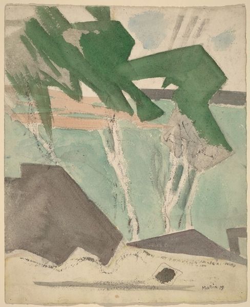 Curator: This is John Marin's "Hohenluft (Austrian Tyrol) [recto]," a watercolor from 1910. Editor: Immediately, there’s a feeling of airy detachment. The washes of color, primarily blues and greens, suggest a high-altitude scene, both serene and slightly melancholic. Curator: Note how Marin captures the essence of the landscape with these delicate watercolor washes. The structure isn't conventionally representational; instead, he utilizes a semi-abstract language. Observe how he divides the composition, leading your eye toward an upper section. Editor: And yet, that very abstraction speaks to the experience of place. The Austrian Tyrol, in 1910, was hardly neutral territory; a region steeped in Austro-Hungarian nationalism on the brink of the First World War. I see a tension between the seemingly apolitical landscape and the socio-political forces gathering in Europe at that time. Doesn’t the lightness feel… almost fragile? Curator: Precisely. He avoids concrete forms, giving way to impressions. I’m drawn to the angular dynamism present, especially when observing how the light intersects with areas left bare, offering the viewer access points. These areas contribute greatly to spatial ambiguities, enriching one's formal viewing. Editor: The colors contribute here as well—soft blues hinting at snow, combined with sparse greens, almost like a suggestion of resistance— life pushing against the overwhelming presence of a wintery expanse. Perhaps there is something to be gleaned from these deliberate choices in materiality, these artistic renderings serving as metaphor for resistance amidst precarity? Curator: An interesting proposal. And yet, to observe his structural strategies allows a recognition beyond explicit context. Editor: Maybe, but situating artwork within broader historical narratives allows us greater nuance. Thanks for pointing out such fascinating formal features! Curator: Indeed. It offers further insight when seen as an expressive and formal experiment, one that stands to be explored.