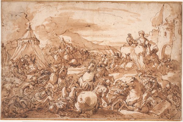 Charles Nicolas Cochin II created "The Rape of the Sabine Women" using pen and brown ink with brown wash on paper. The scene's dynamism is immediately striking, with figures in varying states of action and distress filling the pictorial space. The composition, though busy, is anchored by a raised platform on the left, creating a focal point amidst the chaos. Cochin's use of line and wash directs our eyes, from the gesturing figures on the platform down into the fray. Note how the architectural backdrop, rendered in precise detail, contrasts with the turbulent foreground, hinting at the clash between order and disorder. The monochrome palette enhances the drama, underscoring the narrative's intensity. But beyond the historical subject, consider how Cochin uses form to explore themes of power, violence, and social disruption. The drawing, in its aesthetic arrangement, prompts questions about the representation and interpretation of such events. It remains an open text, inviting viewers to contemplate its implications.