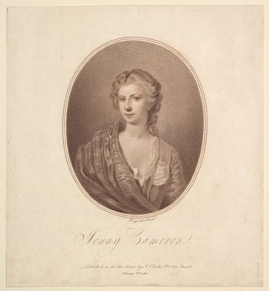 Curator: Here we have a portrait identified as "Johanne Cathrine Rosing," created sometime between 1767 and 1824. It's currently housed here at the SMK, Statens Museum for Kunst. Editor: It has an appealing softness about it. The oval format immediately gives it a feeling of classicism. It seems almost ethereal, especially the delicate lines forming her hair. Curator: Indeed. It appears to be a print, worked with what seems to be very light pencil strokes. It gives a gentleness to the subject. The woman portrayed is framed by an oval, which could be symbolic in and of itself—a container of identity, almost like an icon. Editor: I find myself drawn to the subtle contrast. The artist manages to define form with incredibly limited tonal variation. Note how the draping scarf plays against her loosely curled hair, framed as they both are by this rigid geometric oval. Curator: The inscription below the portrait – "I.C. Rosing" – along with what looks like a dedication, suggests this wasn't simply a commercial endeavor. It might have been a piece intended for personal circulation, a gift among intellectual circles perhaps, solidifying reputation. This textual aspect connects the visual representation with tangible recognition within her community. Editor: That sense of community is reinforced by the intimate scale of the work. One can imagine it residing comfortably within a book, pressed between pages, perhaps cherished by a close acquaintance. It lends an accessibility, doesn't it? A memento mori, but more affectionate than severe. Curator: Absolutely. And thinking about that inscription again... "Truth is your voice; art is your nature" - such complimentary praise in an era deeply invested in virtue and accomplishment. It gives weight to her presence beyond merely visual representation; her reputation echoes throughout the ages. Editor: It's fascinating how much personality the artist imbued with such restraint. Every line feels considered, and it is through these strategic placements, like that light on her brow, that a lively sensibility begins to appear, as if she were present in that moment with the viewer. Curator: Seeing it that way really heightens my appreciation. I will consider those compositional elements much more thoughtfully from now on. Editor: I am going to return to the symbolism embedded within that simple oval... its connotations of eternity certainly give new context to the visual rhetoric found in the delicate rendering of her likeness.