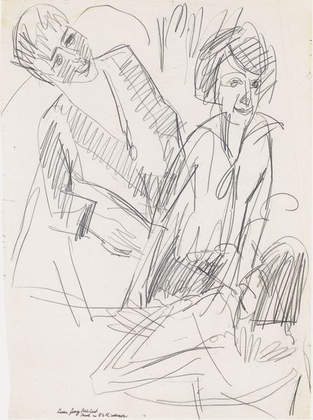Isaac Israels made this drawing of a woman, possibly in an establishment, with pencil on paper. The quick, almost scribbled marks give the impression of a fleeting moment, like a snatch of conversation overheard in a crowded room. It's so immediate, so process-oriented. You can almost feel the artist’s hand moving across the page, capturing the essence of the scene with a few well-placed lines. Look at the woman's hair, those frantic loops give the impression of curls without ever defining a single strand. There is a sensitivity to the line weight, the variations in thickness and darkness, which suggests a keen awareness of light and shadow. Israels reminds me of Degas, who also had a knack for capturing the everyday. The drawing isn't about perfection or detail; it’s about gesture and feeling, an embrace of ambiguity.