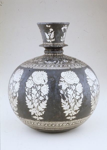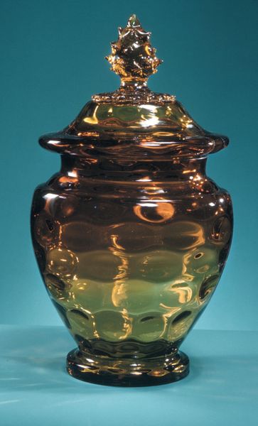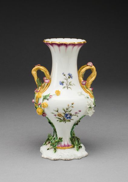 Editor: So this piece is called "Well Spring" Carafe, crafted around 1847, made from ceramic and glass. It’s surprisingly delicate, I imagined decorative art from this period would be ornate and heavy. What historical context shapes how we view this piece now? Curator: That's a great observation. Consider that 1847 was a time of enormous social and industrial change. While ornate styles existed, there was a growing movement towards simpler, "naturalistic" designs. This carafe, with its understated elegance, subtly hints at that shift, but the way it has been celebrated in museum culture positions it, perhaps paradoxically, as the object of elevated craft from an age when mass production threatened the status of traditional craftsmanship. What message do you think the artist wanted to send with this decorative item for the table? Editor: I guess I assumed that art’s value was always consistent, so it's surprising to hear the elite context might not have always been there. I imagine there must have been a broader move to reclaim older aesthetics against machine-made stuff during the industrial revolution? Curator: Precisely. We must see this object as caught up in dialogues about taste, class, and labor. What seems a pretty scene of leaves and flowers is a claim about art's purpose in everyday life. Do you think this object in its time challenged or conformed to established social hierarchies? Editor: Probably conformed - I think luxury products inevitably are aligned with existing privilege... or maybe it represents a very quiet, domestic resistance. I've definitely learned to think about the social role and later museum adoption of art. Curator: It’s about questioning the inherent qualities of the object to consider how social values transform an everyday drinking vessel into a preserved cultural object. I'm glad you found it interesting to unpack all of that together.