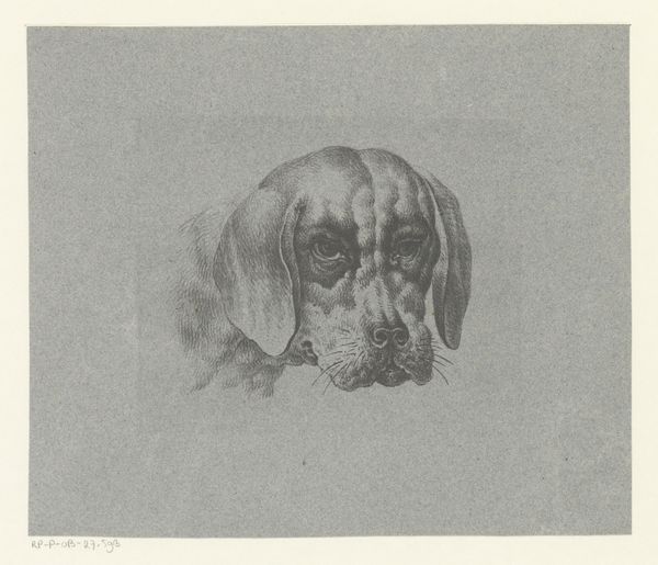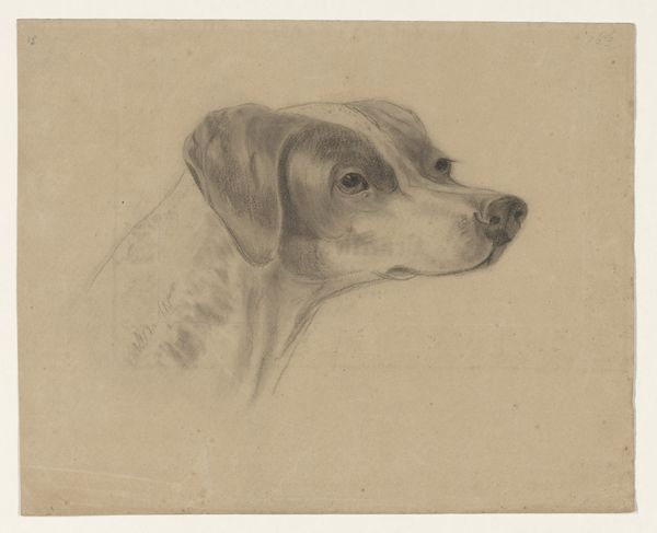 Editor: Here we have Joseph Schippers’ "Head of a Dog with Collar", a pencil drawing from 1894. It's a very simple, almost clinical depiction. I'm curious – what strikes you about the visual structure and composition here? Curator: Immediately, the tight, controlled rendering arrests my attention. Note how the artist meticulously modulates the pencil strokes to sculpt the form of the dog's head. There is a strong sense of geometric order, especially in the juxtaposition of light and shadow. Editor: Yes, the chiaroscuro is really effective. The collar especially; you can almost feel its texture. Curator: Indeed. But it is not simply representational. Observe how the stark lines of the collar serve as a compositional anchor, grounding the subject within the pictorial space. Editor: It's almost as though the dog is a stand-in for another subject. Is there anything further you read into its construction? Curator: Consider the implications of the dog's gaze – averted, perhaps melancholic. This directional vector sets up a powerful visual tension, heightened by the overall tonal restraint. Further, it implicates us, the viewers, who stand in as that to which the animal gazes. This act, combined with its square form in the work, makes the piece a study. The drawing contains its own purpose in the visuality of it all. What did you take from your viewing? Editor: I hadn't thought about the implied relationship with the viewer. Seeing it as a compositional study adds another layer entirely! Thanks! Curator: Quite welcome. It's through close scrutiny that such nuanced meanings are revealed. The visual language is there; we simply need to learn how to read it.