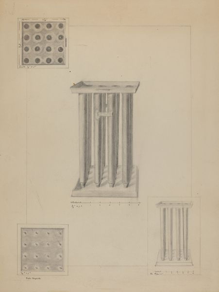 Editor: We're looking at "Wardrobe," a drawing by George Fairbanks from around 1937, made with pencil on paper. It features geometric forms of a wardrobe, laid out like a technical drawing. What strikes me is how functional and purely representational it seems. What do you see in this piece, from a formal perspective? Curator: The line work immediately grabs my attention. Note the artist’s precise application. Each line defines form, delineating edges and volumes. It’s an exercise in geometric purity, wouldn't you agree? Consider the absence of shading. It encourages the viewer to focus solely on the underlying structure and its relationships. Editor: That's a good point. I was initially seeing it as a very straightforward image, but focusing on the *lack* of embellishment really does shift my perspective. Do you think the separation of views contributes to this emphasis on form? Curator: Precisely. The front and side views are segmented and juxtaposed. How does that affect your reading of the wardrobe’s design? Is the relationship more dynamic, or are the structural facets enhanced? Editor: I see how that separation clarifies the structure because you see all its faces, but it also disrupts the object’s unity. It exists only as constituent parts on the page, instead of the 'whole' wardrobe in its natural environment. Curator: That tension—between the analytic clarity and the disruption of wholeness—is the key. We, as the audience, are encouraged to observe and interpret that specific tension to understand the very formal values inherent in this work. What do you take away? Editor: This piece has really highlighted how even technical drawings can be compelling in their structure and line work. Thinking about the artist's decisions about what *not* to include is surprisingly helpful. Curator: Absolutely. Focusing on these artistic choices and formal tensions allows for richer engagement.