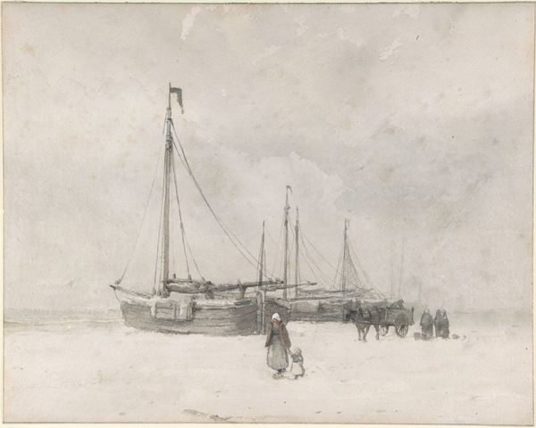 Johann Heinrich Schilbach created 'The Gulf of Pozzuoli' using pencil and watercolor. Note how the composition unfolds through a subtle interplay of light, water, and land. A pale wash suffuses the scene, setting a melancholic mood. Schilbach’s mastery lies in structuring the landscape with minimal yet effective means. The placid gulf acts as a reflecting plane, dividing the composition into two distinct registers. The upper register features distant hills and a promontory capped with fortress-like buildings; these elements are rendered with soft outlines, contributing to a sense of ethereal remoteness. In contrast, the lower register foregrounds the textured earth, executed with delicate pencil strokes and touches of watercolor. Here, Schilbach engages with Romanticism’s fascination with nature and the sublime, mediated through formal means. The artwork does not merely represent a landscape but invites contemplation on how we perceive space and distance.