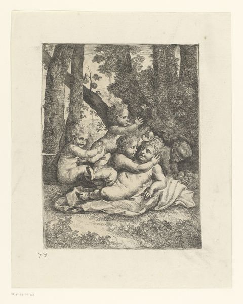 Curator: Up next, we have Rembrandt van Rijn’s "The Sleeping Herdsman" from 1644. It’s a small etching, almost like a captured moment from a lazy summer afternoon. Editor: It feels very pastoral. A quiet, intimate scene, though somewhat heavy. Is it just me, or does it give the impression of profound lassitude? Curator: Rembrandt had a remarkable ability to capture mood and fleeting moments in his prints. The composition invites a study into contrasting light and shadow; its intricate details create a rich texture. He uses shadow, almost dramatically, to define his figures, to suggest this sense of peaceful repose you noticed. Editor: Yes, the cross-hatching and varied line weights really make the tree canopy feel dense and protective. Structurally, you have that strong, dark mass above sheltering these vulnerable figures below. A textbook example of the sublime in miniature, wouldn't you say? The interplay between form and ground really captures your gaze. Curator: Definitely sublime! You're also right in that Rembrandt directs the viewer's focus via dark lines to the foreground, where he's playing with a sort of tableau—a herdsman and two children are resting, seemingly lost in their own worlds beneath a large tree with cows grazing serenely. It evokes reflection on simpler times... less hurried. He renders the whole scene with delicate pen-ink. Editor: The sleeping figures almost merge into one mass, reinforcing their tranquility and the cyclical, uneventful, eternal rhythm of rural life. Perhaps, they're literally embodying the landscape in its repose. Curator: Yes! It's very possible. Maybe he also captured something profound in the mundane activities, elevating the common folk and inviting viewers to find beauty in the simplicity of everyday life. After all, a life spent sleeping under a shady tree in summer also has an enviable side. Editor: Precisely. It’s the enduring power of art; its capacity to ennoble seemingly inconsequential subjects while subtly guiding the viewer’s perception. It certainly made me think.