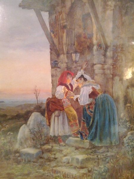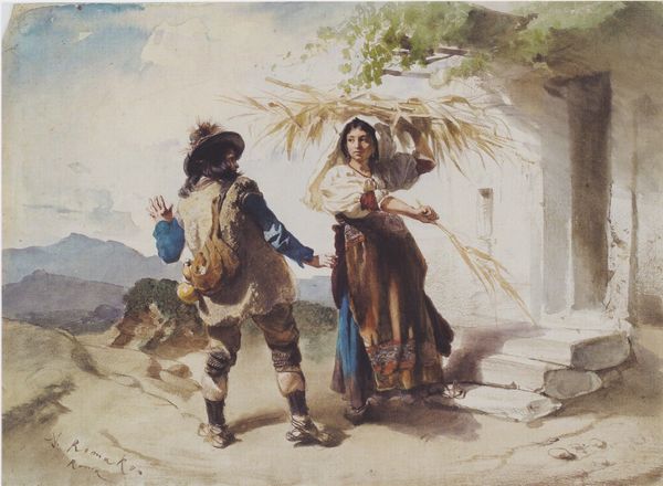 Curator: Welcome. We are looking at "La Fiancée D’abydos", or "The Bride of Abydos," an oil painting crafted around 1850 by Théodore Géricault. Editor: Immediately, I notice the contrast! The dramatic dark backdrop emphasizes the figures. There's a certain tension, like a moment of decision hangs in the air. Curator: Precisely. This narrative pulls from Lord Byron's poem of the same title, a popular subject within Romanticism. Note how Géricault’s material handling builds drama: coarse brushwork in the rocky surrounds juxtaposed with finer detailing on the garments. Editor: The clothing is certainly evocative! Her veil, his turban... the artist uses specific markers to communicate the context, hinting at cultural traditions and perhaps the conflict inherent within them. It feels both intimate and theatrical. Curator: Yes, Byron's poem delves into forbidden love amidst cultural clashes. Gericault presents us with more than just figures; he's embedding Byronic symbolism of doomed romance into his pigment. We see daggers hanging in the background like signs and symbols of their inevitable demise! Editor: The very act of producing an oil painting during this era involved certain class dynamics; Géricault was tapping into Romanticism's orientalist leanings. Was he genuinely interested in a clash of cultures, or was he consuming and exoticizing this East-meets-West theme for an upper class consumer? What labor conditions were these materials even manufactured under? Curator: A critical query to bring forth, always. While your process-oriented concerns are absolutely valuable, look how Gericault used the act of depicting costume and custom as visual language! The positioning of each subject as well feels potent... almost archetypal. Their gaze tells us this is a pivotal moment, frozen forever. Editor: And those costumes... the tactile richness of those colors must have relied on global trade, and pigment creation practices of that day were far removed from today’s industrial model. The painting’s subject mirrors the consumption of labor, and global resources needed for its completion! Curator: True, the raw materials hold global ties, undeniably. Yet the scene Gericault chooses depicts how individuals navigate pre-existing beliefs, both trapped, bound to these iconographies and attempting, though failing, to act outside the bounds of it all! It's a complex commentary painted onto this canvas. Editor: A clash in the painting mirrors a clash in our modern gaze. His visual metaphors meet our materialistic analysis head on!