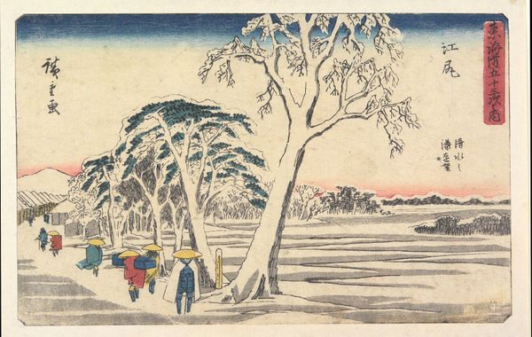 Editor: Here we have Utagawa Hiroshige's woodblock print, "Distant View of Shimizu Port from Ejiri," created around 1841-1842. It's stunning – the way the snow weighs down the trees. How do you see the impact of the print medium here? Curator: As a materialist, I’m drawn to consider this print's production within its social context. These ukiyo-e prints weren't singular masterpieces, but mass-produced objects, readily available and relatively inexpensive. Think about the woodblock process – the labor involved in carving the blocks, applying the ink, and pressing the image. Editor: That's a really good point! So the *act* of making many identical images is significant, not just the final artwork? Curator: Precisely. It democratized art, bringing landscape views to a wider audience. These scenes were commodities in a way, consumed visually. What does the serial nature of printmaking tell us about 19th-century Japanese culture's relationship to landscape and leisure? Editor: I guess I never thought of it that way! It reframes how I understand it. I was so focused on its aesthetic value! Curator: The artistry is undeniable, but let's consider the material and the process behind it. The choice of ink, the grain of the wood – they all contribute to the image and our interpretation of the scenery and also contribute to its commodification and consumption. It makes you consider the social status afforded to art and accessibility. Editor: That’s fascinating. Seeing it as a product of a larger system changes my understanding entirely! Thanks! Curator: Absolutely! Thinking about the material realities can reveal hidden layers.