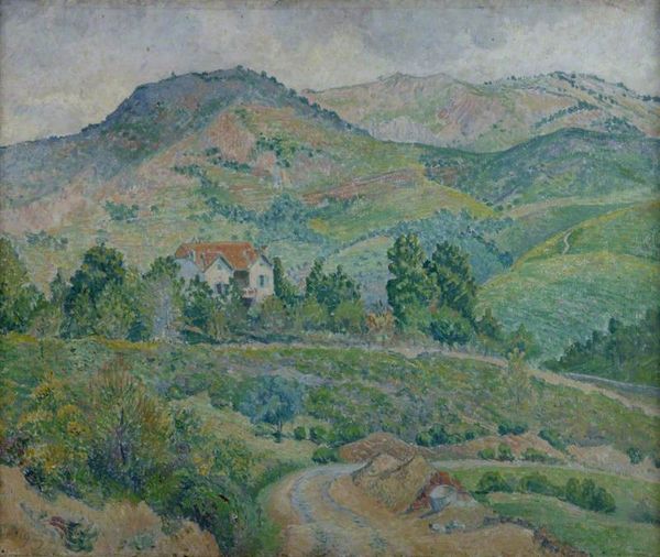 Editor: This is "Almond Trees, Le Lavandou," painted by Lucien Pissarro in 1923. It's an oil painting, and it feels like such a peaceful scene, with those soft colors and gentle slopes. What really stands out to me is how the blossoming trees seem to frame the distant mountains. What do you see in this piece? Curator: The almond tree itself is incredibly symbolic. Across cultures, it signifies awakening and rebirth, and even hope. In this Post-Impressionist landscape, the blossoming trees might represent not just the literal arrival of Spring, but also the renewal Pissarro sought after the First World War, wouldn’t you say? What other details jump out to you? Editor: I also noticed how he used these little dashes of color, almost like he was building the landscape out of tiny gems. Curator: Precisely! That pointillist technique echoes back to his father, Camille Pissarro. Consider how these small dabs, juxtaposed with the bare branches, create this sense of transient beauty. Lucien employs a similar shorthand with the mountains and village, hinting at permanence juxtaposed with fragility. It gives this vista an eternal quality, no? Editor: I think I do see that! There's a kind of tension there, a fleeting moment captured against this much bigger landscape that’s been here for ages. It’s more complex than I first thought. Curator: Exactly! Art isn’t just about the scene; it is about how cultural memories inform how we observe and document our observations through painting. The painting reflects how landscapes are filled with psychological, and perhaps historical meaning, beyond pretty aesthetics. What a beautiful exploration! Editor: I agree! Thanks, that really changed how I see the painting, from a pretty picture to something really full of meaning!