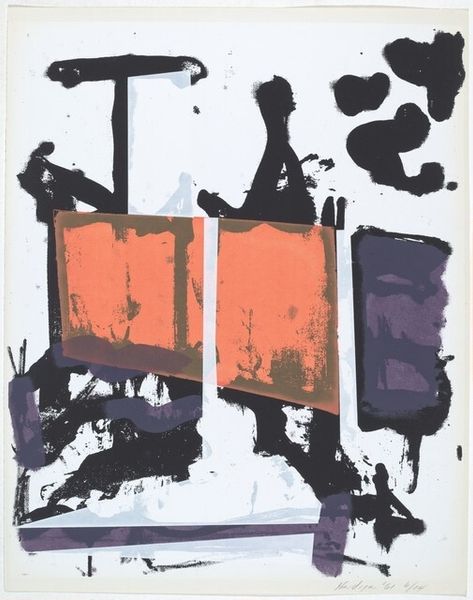 Editor: So, this is "A Two Sunday Week" by Claude Lawrence, made in 2014. The painting seems to incorporate both drawing and painting elements with acrylic paint and what looks like linocut prints on canvas. The composition feels chaotic but grounded by these solid shapes. How would you interpret this work? Curator: The painting presents a stimulating arrangement of forms and lines. What first grabs my attention is the interplay between the solid black shapes, almost calligraphic in nature, and the more loosely applied yellow strokes. This push and pull creates a visual rhythm. How do you read that large central shape, almost like a tent or abstracted figure? Editor: It's interesting you say that. It reminds me of a house frame, or perhaps an abstract mountain. The layering gives the whole piece a spatial complexity that seems intentionally ambiguous. Is the dynamism of the line work suggestive of any particular influence? Curator: The dynamic lines suggest an Abstract Expressionist influence, particularly in its emphasis on spontaneous gesture. However, Lawrence also incorporates graphic elements, leading the eye across the surface in a deliberate manner. Do you think that this blending creates tension, or harmony, within the painting's structure? Editor: I think it adds tension and interest. It's like the rational and the intuitive are in conversation with one another. Are the colour choices contributing in a comparable way? Curator: Absolutely. The palette is restrained: black, yellow, and an off-white background. This creates a strong contrast and directs our focus to the structural components. Perhaps, Lawrence uses the colors to draw the eye to various sections of the image so the eye is not immediately fixed to the center. What’s your sense? Editor: Yes, I think the limited palette forces you to consider the relationships between the shapes more carefully. I see how he's using simple means to generate complexity, which I find compelling. Curator: Indeed. This focus on intrinsic elements is where the power of the work lies. Editor: Thanks. It has given me so much more to consider. Curator: My pleasure, this type of formal reading, is really what art is about.
