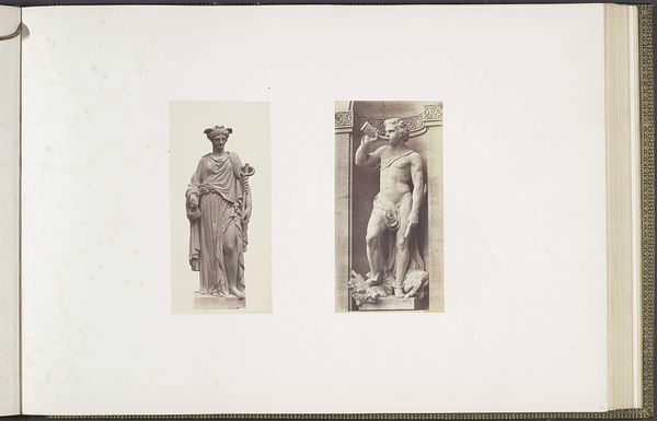Curator: Here at the Rijksmuseum, we have Edouard Baldus's gelatin silver print from around 1855-1857, “Gipsmodellen voor beeldhouwwerken op het Palais du Louvre," showing plaster models of sculptures. The sculptures themselves depict Philippe de Commines by Eugène Louis Lequesne, and Amyot by Pierre Travaux. It has a surprisingly muted tone for what I imagine was a bold statement piece for its time. Editor: It’s austere, even. The figures are presented in isolation against that stark background. Immediately I’m drawn to the composition. The contrast is quite striking between the draping and rigid, and yet each has a kind of stoic repose, doesn’t it? Curator: Absolutely. Baldus was commissioned to document aspects of the Louvre's reconstruction under Napoleon III, and this image captures these sculptures which were intended to project a certain nationalistic, historical narrative. These men represent powerful figures who were part of France’s historical lineage, thus visually solidifying and lending credence to Napoleon’s vision for France. Editor: Tell me more about how Baldus renders the materiality of these plaster casts. It almost undermines their intended grandeur, doesn’t it? The photographic lens seems to democratize them. Stripping away their inherent authority to allow them, perhaps, a common, more tangible connection to the viewer. The texture appears smooth, even fragile. Curator: I agree. Baldus seems to subvert, consciously or not, that glorification by reminding us they are mere reproductions, stand-ins if you will, of historical might. This in itself is significant. He provides a discourse regarding what it means to construct, or perhaps more accurately reconstruct, a nation’s identity. Editor: Yes, they’re presented more as relics, which evokes an atmosphere that subtly questions the nature of representation. Curator: Indeed, which prompts us to consider: what and whom are we choosing to represent, and why? This speaks to a key component when dealing with historical legacies, particularly colonial ones: what's highlighted versus what's omitted shapes how history is collectively remembered and understood. Editor: Examining the stark contrasts and tonal subtleties, one gets this wonderful sense of the artist challenging the established Academic style in which the sculptures were formed. It allows for an interesting juxtaposition. Curator: A perfect illustration of the layered conversations within a single work. It underscores art’s capacity to invite these critical dialogues on the very nature of power, representation, and collective memory. Editor: Right, by revealing its own artifice. Fascinating.