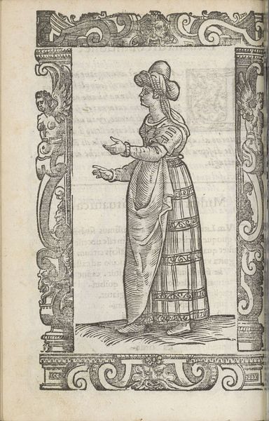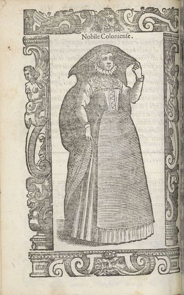 Curator: Immediately I see old photographs of my grandmother. A sepia tone and quietness. What’s striking about this “Nobile di Boemia” is how she seems caught between worlds – her garments suggesting both solidity and ephemerality. Editor: That’s interesting! This print, from 1598, is the work of Christoph Krieger. I love the swirling details, the borders packed with grotesque masks that contrast wonderfully with the solemn figure at the center. An enigmatic flower adorns her hand. It feels very… Mannerist, almost playfully artificial. Curator: Artificial indeed, or deliberately stylized. These borders are such curious spaces. Perhaps the flower serves as an emblem. Smell carries memory powerfully. Editor: Absolutely, flowers often symbolize transience, beauty, or remembrance. It is the flower that transforms this composition. Krieger's rendering almost presents this figure in conversation with mortality. Notice the contrast between the very intricately patterned costume and that fragile thing in her grasp. Curator: It certainly speaks to the ephemeral, yet I wonder if we see a person trying to hold onto something beyond herself through social rituals, hence the detailed costume. Does this emblem offer immortality by associating this noble lady with the perpetual symbolism of nature? Editor: Maybe. To me the surrounding patterns, the frame itself with its tiny faces, it’s like a container for this moment, a conscious memorial that speaks directly about societal codes and how we preserve an identity. I wonder if Krieger considered its shelf life! The delicate lines are like memory itself, slightly faded but intensely evocative. Curator: Yes, a vessel. You feel the delicate line-work, and the layers of possible meaning. Like whispers of memory carried through time and printed, quite literally, into permanence. Do you believe it will be cherished long after us? Editor: The power of symbols lies precisely there—in speaking across epochs. Krieger did good! It remains potent!