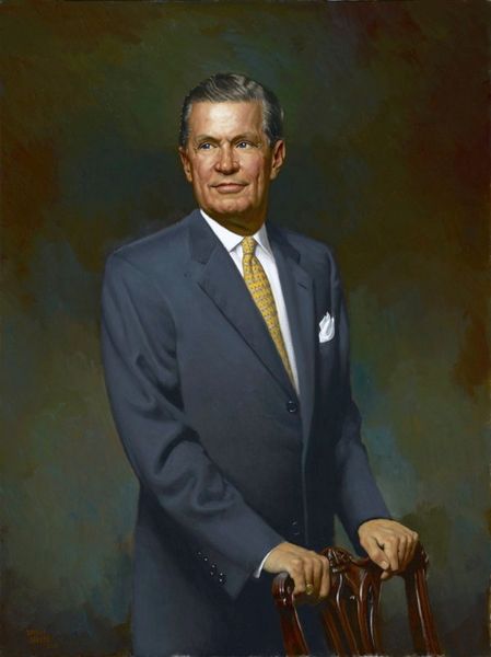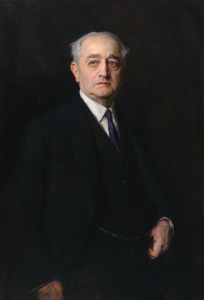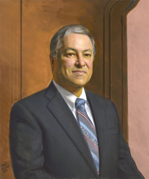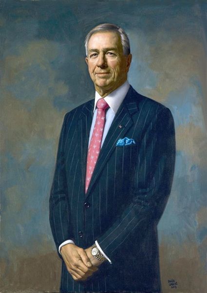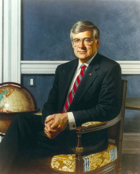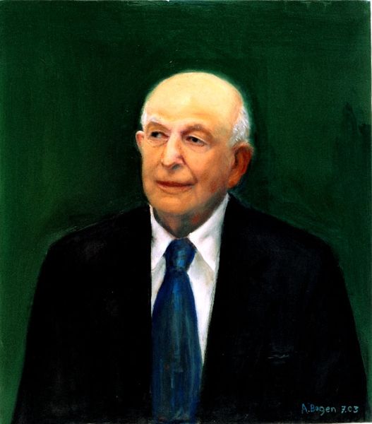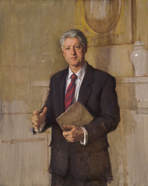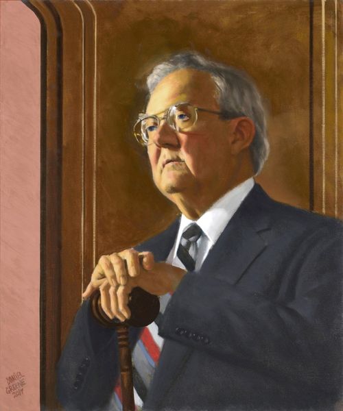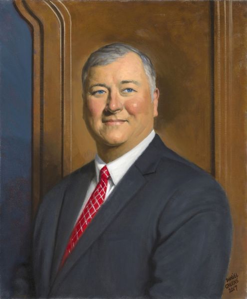 Editor: Here we have Daniel Greene's 2017 oil painting, "Jerry Richardson, Former Owner, Carolina Panthers, Wofford College." There’s a certain formality, even gravitas, that comes through. I wonder, how do you read this portrait? Curator: This portrait is very telling of cultural narratives and aspirations. Look at the objects chosen: the books and the football. They are powerful symbols here. It invites questions. What do these items collectively signify about Richardson’s life and legacy? Does this portrait reinforce established power dynamics or perhaps challenge them in subtle ways? Editor: It's interesting how the objects provide a biography. He must have considered himself both a scholar and sportsman? Curator: Precisely. In Western portraiture traditions, such symbolic inclusions date back centuries. These symbols are rarely arbitrary. Ask yourself, what cultural values are being amplified here? Also, notice how his gaze meets ours. Editor: Yes, he's very present. Is that intentional? To make him appear relatable? Curator: Potentially. Artists are strategic in deploying glances. Direct eye contact can signify honesty and strength. How do you think that detail functions in light of what you know about this public figure and his story? Do the objects and his expression tell the same story, or are they at odds? Editor: That's a really good point. Perhaps the gaze invites you in, and then the symbols prompt deeper questions about who is invited in and why. It really does say a lot about not just the subject but how they wanted to be perceived, and by whom. Curator: Exactly! Now you're diving deeper into the layered meanings, the continuous dialogues across cultures, and the cultural imprint the image hopes to leave.