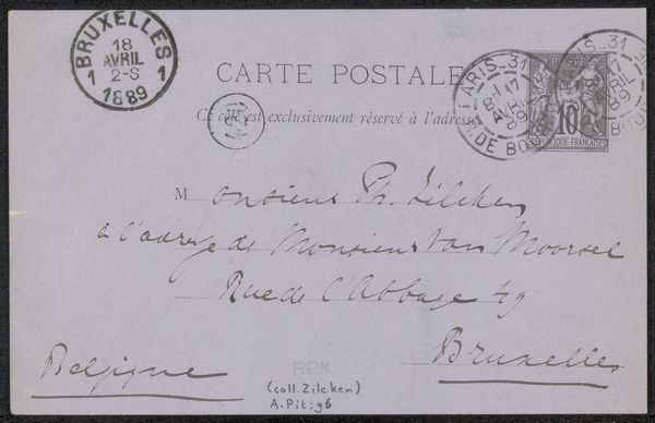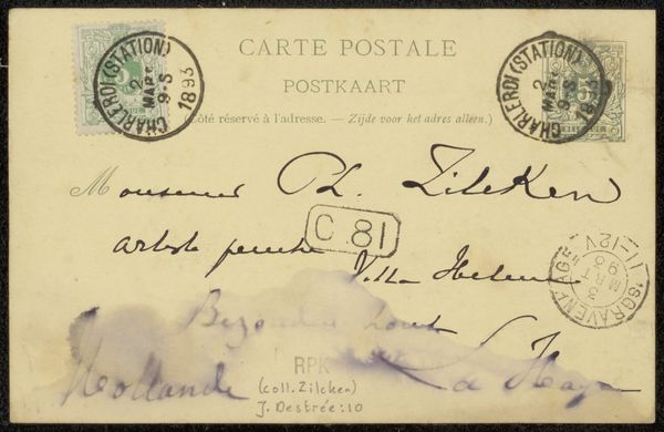 Editor: This is a postcard, titled "Briefkaart aan Philip Zilcken," likely from 1887. It’s a drawing and print using ink on paper. I find the presence of postal stamps quite striking; they really root it in a specific moment and place. What stands out to you? Curator: Beyond its face value as correspondence, it's fascinating to consider how seemingly mundane objects like this postcard function as historical artifacts. Its value extends beyond its artistic merit, offering a glimpse into the social networks and cultural exchanges of the time. Editor: Could you elaborate on the social aspect? Curator: Certainly. The act of sending a postcard speaks to a culture of communication, of course, but consider also, who were Adriaan Pit and Philip Zilcken? Exploring their roles within artistic circles could reveal how networks of artists, writers, and critics influenced artistic trends. How did their relationships with institutions like the Rijksmuseum, where this postcard now resides, shape their legacies? Editor: That's a really interesting point. Thinking about it as a record of a relationship within a specific art world context really changes how I see it. Curator: Exactly. Also, examining the postal markings reveals details about the postal system itself – its efficiency, reach, and its role in connecting people across distances. Even the choice of stamp and the handwritten address tell a story. How does this object reflect, or even resist, the established art world hierarchies of its time? Editor: I hadn’t even thought about resistance, but now that you mention it, the casual nature of a postcard could be seen as a contrast to the more formal methods of art communication at the time. Thanks, that gives me a whole new perspective. Curator: My pleasure. Sometimes, the smallest objects offer the most profound insights into the past.