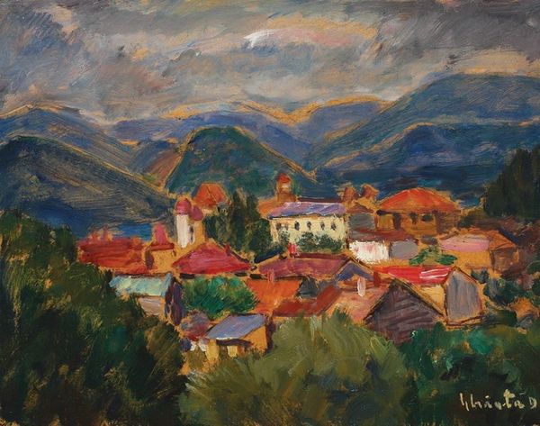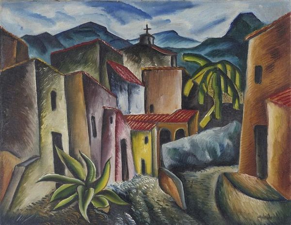 Curator: This is Pyotr Konchalovsky's "Mount Cassis," painted in 1913. An oil on canvas, it captures the light and landscape of Southern France. Editor: It has such a strange tranquility about it, like a paused breath. The greens are so dense and the houses seem almost toy-like, perched there. What do you make of the composition? Curator: Konchalovsky uses these powerful blocks of color. Notice how he flattens the perspective, pushing the mountain right up against those crisp, almost geometric houses. It's like he's simplifying the world, not necessarily as he sees it but how he *feels* it. It connects to Post-Impressionism’s exploration of subjective experience. Editor: It's definitely emotional. The brushstrokes seem quick, confident. Those tall cypress trees punctuate the foreground—they almost feel like dark sentinels. There's a brooding intensity too, would you agree? Knowing it's 1913... I wonder if the world’s approaching turmoil influenced his rendering of that weighty stillness. Curator: It’s an interesting theory. Art certainly doesn't exist in a vacuum! Konchalovsky, coming from a generation deeply affected by political upheaval in Russia, might have been drawn to the seeming permanence of the landscape as a kind of refuge. The choice to portray Cassis in this almost simplified way is telling, perhaps seeking a stable anchor as Europe prepared to descend into chaos. Editor: The weight in the colors emphasizes your perspective. All this makes me appreciate it even more. It's not just a pretty landscape. Curator: Exactly! And consider its accessibility within a museum. The artwork lets people engage with the intersection of art and broad historical contexts. It becomes a stage for considering how anxieties shape vision and how art helps preserve memory. Editor: Yes, like visual time capsules. Well, next artwork? Curator: Sounds good. Let's go.