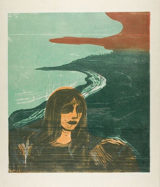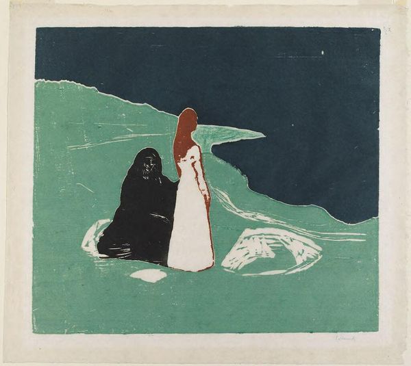 Edvard Munch created this image of two women on a shore using woodcut and lithography, techniques that allow for a remarkable interplay between graphic precision and painterly effect. The rough texture of the woodblock gives the print an immediate, tactile quality. The stark contrasts, achieved through bold cuts in the wood and the flat application of color, emphasize the emotional weight of the scene. Look closely and you’ll notice how the grain of the wood subtly appears within the green field, unifying the composition. Munch’s technique in this work highlights the physicality of printmaking. The process transforms the act of image-making into a physical labor, pressing ink onto paper to capture a fleeting moment. It’s a testament to how materials and making can imbue an artwork with layers of meaning, far beyond its representational content.