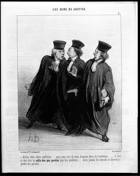 Editor: This is "Lost again in the Royal Court... and he laments..." by Honoré Daumier. The use of line is just incredible, giving a sense of heaviness and despair. What is your interpretation of this work's composition? Curator: Observe how Daumier employs contrasting values to delineate form. The stark juxtaposition of light and shadow creates dramatic tension, emphasizing the figures' emotional states. Note how the arrangement directs the viewer's eye. Editor: I see that, the direction of the light seems very intentional. Curator: Indeed. The diagonal thrust of the composition further reinforces this sense of unease. The figures are carefully arranged to convey a specific narrative and elicit a particular response. Do you agree? Editor: Yes, I think I'm starting to understand what you mean. Thanks for your explanation. Curator: It's through such formal analysis that we can begin to decode the artist's intent and the work's inherent meaning.