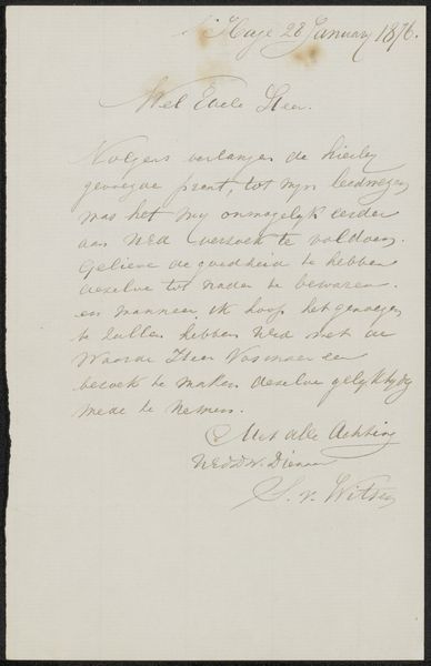 Editor: This is “Brief aan anoniem,” or “Letter to Anonymous,” by Johannes Bosboom, created sometime between 1827 and 1891. It’s an ink and pen drawing on paper. The intimacy of the script and the simple materials make it feel like a stolen moment. What story do you think it tells? Curator: It invites a certain kind of speculation, doesn't it? Consider the context: Bosboom worked in a period defined by rigid social structures, and the simple act of writing—especially to an anonymous recipient—could represent a subtle act of defiance, even resistance. Editor: Resistance? It’s just a letter, right? Curator: Think about who has the privilege to write, and to whom, in this period. Who has the power to communicate freely without fear of judgement or censorship? Perhaps this anonymous letter represents a suppressed voice finding its way into expression, a longing for connection outside of societal constraints. What do you make of the almost invisible number "5" in the upper left corner? Editor: I didn’t even notice that! I guess it could suggest this is part of something larger, maybe a series of clandestine correspondences? That's interesting. So even a seemingly mundane object like this can be politically charged? Curator: Precisely! Art often whispers the unspoken truths of its time. By analyzing the historical and social landscape, we can unearth these layers of meaning. It prompts us to question whose stories are told, whose are omitted, and what power dynamics are at play. Editor: Wow, I never thought about a letter this way before! Thanks for broadening my perspective. Curator: It is a joy to reconsider even the familiar in this way.