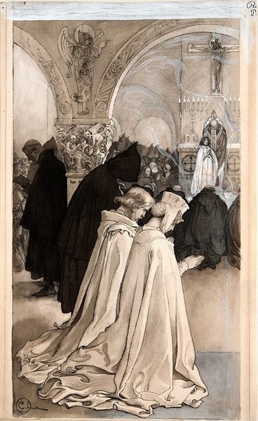 Curator: Here we have Robert Smirke's pen and charcoal drawing from 1822 entitled, "Feste, as Sir Topas, addressing Malvolio". It illustrates a scene from Shakespeare's Twelfth Night. Editor: Oh, how wonderfully theatrical! The use of charcoal and pen really creates a dramatic atmosphere, all sepia tones and lurking shadows. There’s definitely a sense of mischief and perhaps even cruelty in the air. Curator: Yes, Smirke was quite adept at capturing theatrical moments. As a history painter, his works frequently illustrated literature. He capitalized on the vogue for Shakespeare in British popular culture, producing accessible art for a broad audience. Note the way he stages the composition, almost like a play within the drawing. Editor: Exactly! And the figures... Feste, looming in his disguise, Maria, her ear pressed mischievously to the door, and Sir Toby Belch, lurking, holding a goblet and reveling in the chaos. Their posture speaks volumes. It all points to themes of deception and trickery. I’m intrigued by the way Smirke renders Feste's clothing - the layers, the bulk... there's an imposing quality even though he is technically playing the fool. It makes me think of ancient rituals where dressing in disguise blurred the line between the human and supernatural, bringing to mind the figure of the shaman. Curator: An interesting parallel! And yes, you are right: that tension between foolery and profound insight, typical of the Shakespearean fool, is vividly portrayed. Consider also, though, how paintings such as this circulated through engravings. Smirke understood the print market well. His artistic choices helped him to craft very popular images, offering moral and historical narratives. Editor: This adds another layer. These symbolic enactments gain political force through wide circulation, touching people in their private homes and shaping the imagination. It creates a collective memory through repeated circulation of certain forms of imagery. The image taps into familiar symbols like folly, plotting, eavesdropping... elements that connect with timeless aspects of human nature. Curator: That’s precisely what made Smirke so successful: accessible images, moral themes, readily available and easily understood. A brilliant reflection of the public's appetite for narrative art at the time. Editor: Absolutely! And from my perspective, the durability of symbols ensures that even today, separated by centuries, we are immediately keyed into the emotional dynamics represented.