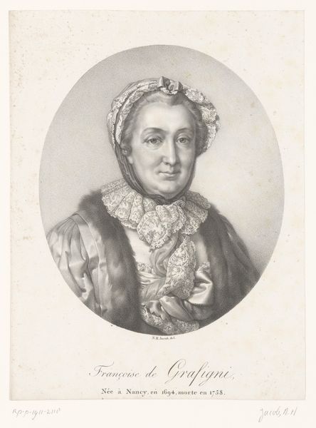 Curator: Before us is “Portrait of Hannah Pritchard,” an engraving created between 1762 and 1764 by James McArdell. Editor: My first impression is one of quiet opulence. The textures in the rendering of her fur stole and satin dress are beautifully realized through the monochromatic engraving. Curator: Indeed, the print's rococo style is apparent in the swirling, elegant lines. Let’s consider the framing device: that oval vignette concentrates the viewer's eye, forcing a deep inspection of the face and her posture. Editor: I’m particularly drawn to the book she’s holding. The book serves as a key symbol; considering Pritchard was a celebrated stage actress, perhaps it points to the scripts she used or a broader commentary on her intellectual life, in addition to her performance persona. Curator: An excellent point. It creates a compositional balance, mirroring the curve of the oval surrounding her face and directing the eye towards the subtle gradations of tone. Notice how McArdell contrasts the soft luminosity of her face against the darker tones of the background. Editor: And the fur stole draped so deliberately? That reads as a symbol of wealth, but also protection – perhaps of her own carefully constructed image and professional role within theatrical culture. Pearls and lace also amplify the visual emphasis on elegance. Curator: We must remember how portraiture, particularly engravings, served to disseminate images widely in the 18th century. The choice of details—the fur, jewelry, the very presentation—was meticulously planned. Editor: Which highlights the negotiation between public image and private identity—something Hannah Pritchard certainly navigated professionally. Looking at this, I ponder the artist’s intentions, what details are true versus embellishments that suited 18th century expectations. Curator: Reflecting on it, it shows a restrained command of light and shadow which builds up and directs our gaze while simultaneously revealing wider societal considerations, power and femininity during the era. Editor: Absolutely; her carefully considered adornments serve as a quiet mirror, subtly reflecting social and psychological dimensions during the golden age of theater.