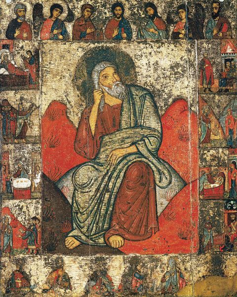 This icon of St. Mark, created by an anonymous artist, presents a striking combination of the divine and the mundane through its material form. The gold background, a traditional symbol of heavenly space, is juxtaposed with the very earthly scene of Mark seated at a desk, absorbed in writing. Note how the composition divides the space. The upper portion, dominated by the radiant gold leaf, suggests the eternal and the sacred. Below, the architectural details of the desk and stool, rendered with careful attention to line and pattern, ground the figure in a tangible reality. The artist uses colour to further this contrast. The deep blues and reds of Mark's robes create a sense of weight and presence, while the delicate pinks and greens of the desk introduce a note of domesticity. The overall effect is one of profound stillness and contemplation, inviting us to reflect on the intersection of the spiritual and the everyday in the act of creation. The visible craquelure and wear of the icon only serve to enhance its sense of timelessness.