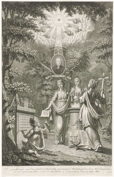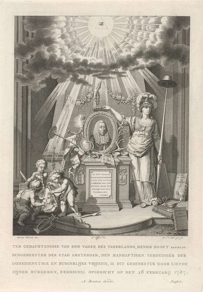Noach van der Meer the Younger created this print titled, Monument to Hendrik Danielsz. Hooft in 1787. It’s an allegorical representation of the life and legacy of Hendrik Hooft, a prominent Dutch regent and politician. In the print, Hooft’s portrait is crowned by a female figure embodying the idea of the Dutch Republic, symbolizing his service and dedication to the state. The putti in the foreground represent aspects of Hooft's character and achievements, like wisdom, justice and prudence. The radiant light and clouds in the background evoke divine approval. The image is a reflection of the values and ideals of the Dutch Enlightenment, and the importance of civic virtue and public service. The imagery employed does not challenge, but maintains the traditional representations of power and authority. Yet I wonder, can you feel the artist’s pride in the values of the Dutch Republic, but also a deep sense of loss for a past era?