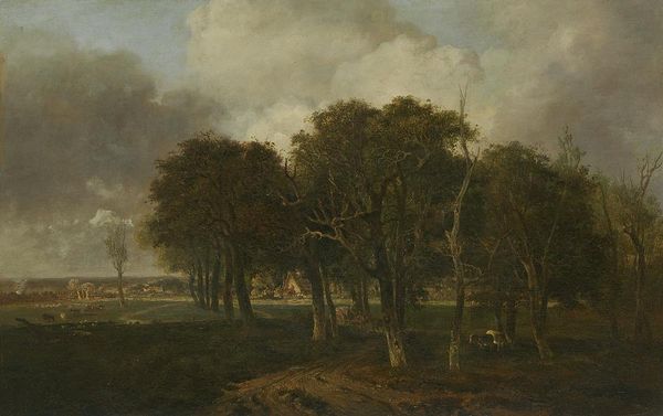 Curator: Standing before us is John Constable's "East Bergholt," an oil on paper work dating from about 1813. Editor: Oh, hello there, old moody sky. I see you lurking, adding all the drama. You look like one big thought bubble! Curator: Precisely. Notice how Constable divides the picture plane, giving roughly two-thirds of the area to the sky. The weight of the composition rests there, influenced as much by the feathery cumulus formations as by the artist’s tonal values. Editor: You said cumulus, heh heh. Seriously, though, the clouds give it an unsettled vibe. Almost like you know a summer storm's gonna break loose any second. But down below it’s all chill green and rolling hills. Cows, trees… ah, the peaceful countryside! It's like a mood swing in paint form. Curator: A perceptive interpretation. Constable expertly juxtaposes those ephemeral cloudscapes with more permanent features of the land, creating a dialogue between the transient and enduring. The composition itself plays a vital role. His deployment of chiaroscuro is strategic—it accentuates forms while lending depth and movement. Editor: Chiaroscuro? Okay, I’ll give you that one. I just think that sky tells its own story. Like a painter letting his emotions out, big brushstrokes and all! Plus those greens are great. Can almost smell the fresh-cut hay. You reckon he painted this outside? Curator: The artwork possesses an en plein air sensibility, indeed. The surface bears tangible signs of brisk, unlabored execution, making the experience directly accessible to the beholder. Editor: Accessible, yeah, that's it. No highfalutin art speak needed here—just a cloudy day, some green, and those chilled-out cows. Curator: An unpretentious scene it may be, yet meticulously designed nonetheless. Well, this was a rewarding assessment; it brings forth a deeper appreciation of Constable’s vision. Editor: For sure. This landscape ain't just some pretty view. It's a whole, real, and breathing mood! I think, it sums up country life.