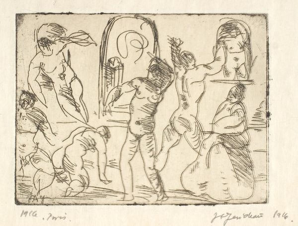 These sketches were made by Sir David Wilkie in the early 19th century, using pen and brown ink on paper. These materials are simple, humble, and immediate - nothing fancy, but perfectly suited to capturing fleeting ideas. You can see how Wilkie used the pen to quickly block out the figures, using light and shadow to suggest their forms. The paper itself is also important. Its absorbency allowed the ink to spread slightly, creating a sense of depth and atmosphere. The use of pen and ink suggests a direct connection between the artist's hand and the image. There's no complex machinery or industrial processes involved here, just a skilled hand and a practiced eye. But the study is an important aspect of art production. The drawing allowed Wilkie to explore different compositions and poses, and to refine his ideas before embarking on the final painting. This is where the real work begins, the material and the making process are vital to understanding the artist's intentions and creative process, and challenge the traditional boundaries of art history.