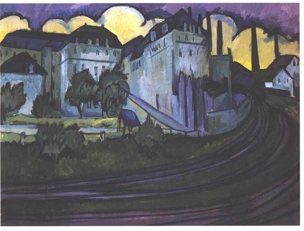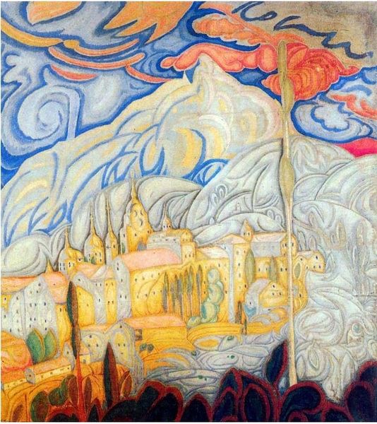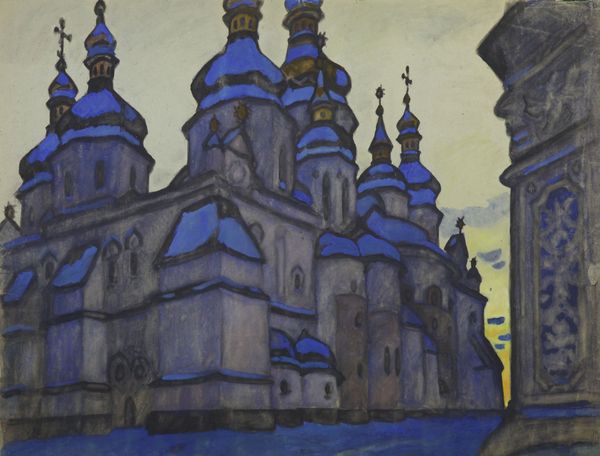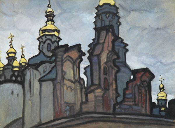 Curator: Standing before us is Yuriy Khymych's "Golden Gate (architectural motif)," created in 1960 using tempera. A rather striking piece. Editor: It feels intensely somber, almost like looking at a forgotten memory. The cool blues juxtaposed with the fiery oranges are arresting. There's a strange comfort in it though, like a fairy tale city emerging from the shadows. Curator: Absolutely. Khymych’s application of Byzantine art principles melds historical architecture with the expressiveness of painting. Notice how he abstracts the forms of the Golden Gate, emphasizing the geometry and structure. It invites an intellectual examination of architectural forms and the cultural weight it holds. Editor: For me it is the light. The thick impasto application creates a tactile dimension to these ethereal or fortress-like architectural masses; one almost expects to feel a texture of cool shadow mixed with ochre firelight... The painting appears both earthbound and transcendent simultaneously! The architecture is geometric yes, but is imbued with soul. Curator: An intriguing duality, certainly. Consider the role of tempera; this medium affords the piece a particular luminosity, enhancing its almost otherworldly effect. Moreover, reflect upon what this structure – the Golden Gate – once signified historically. Here it seems less a historical record and more like... an echo, distorted and impressionistic, yet resonant with symbolic presence. Editor: Echo is a perfect way to frame it. Almost like staring into the depths of one's psyche! The interplay of light, shadow, geometry, and organic cloud shapes create an unexpectedly intimate visual poem. It evokes feelings of reverence, remembrance, and quietude; so much more that just geometry! Curator: Precisely. The dialogue extends past the concrete and heads to something…more abstract, allowing room to imagine more interpretations and a more intimate look to what architecture truly embodies in people's mind. Editor: Agreed. It is always fulfilling to unearth the complex layers of emotional and intellectual substance embedded in such deceptively simplistic images! This tempera work has made me revisit what "golden" might signify.