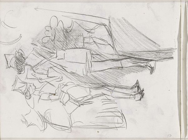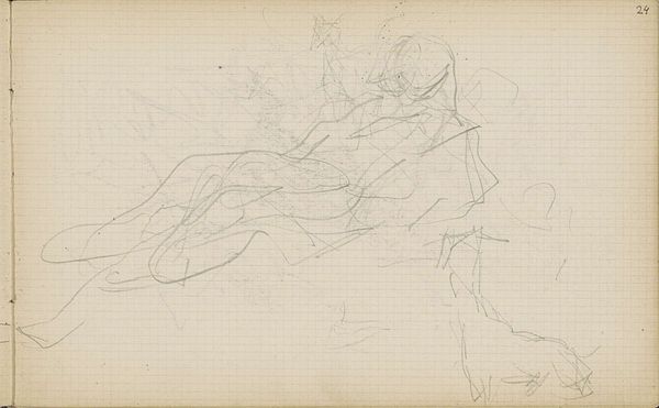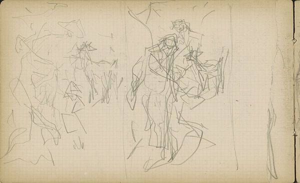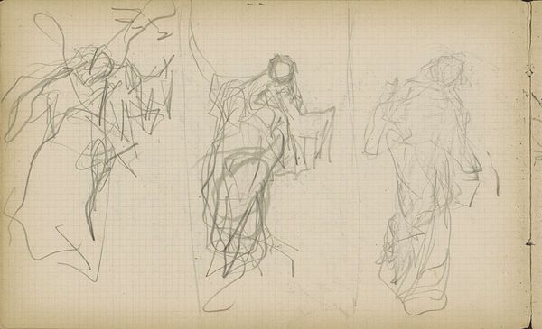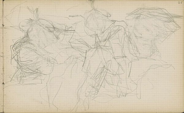 Editor: This is a drawing entitled "Studieblad, onder andere met twee figuren die zij aan zij staan," which translates to "Study sheet, including two figures standing side by side." It was created by Matthijs Maris between 1849 and 1917. The medium appears to be pencil on paper, and it's currently held at the Rijksmuseum. I am struck by its ghostly quality, these figures emerging from a mass of scribbled lines. It feels incredibly raw and immediate. How do you read this piece? Curator: Focusing on the formal elements, we observe a fascinating tension between the defined figures and the chaotic surrounding lines. Maris doesn't offer us clear contours; rather, he builds form through accumulation and variation in the density of these marks. This incompleteness invites interpretation. Consider the texture of the paper itself – almost like a grid – in contrast to the figures, which imbues it all with an almost otherworldly dimension. Is this purely an exercise in form, or do you detect emotional content in the way Maris deploys line and tone? Editor: I see what you mean about the grid; it lends a sense of underlying structure even within the sketchiness. There's something almost hesitant about the linework; a delicacy, but also a vagueness. I think it projects a certain vulnerability or sense of transience. Do you think the rapid execution conveys the intended meaning, or does this emphasize more the process of creation over narrative? Curator: Ah, a crucial question. From a formalist standpoint, we must focus on the ‘how’ over the ‘what’. Consider the use of layering: areas of dense, dark hatching build form and volume, juxtaposed against lighter, almost ethereal lines suggesting movement and even perhaps an inner state. The inherent flatness of the paper, a critical property of this work as a drawing, contradicts these intended spatial illusions, generating an internal dynamism and emphasizing the materiality of the medium. Editor: That's a fascinating observation; the flatness paradoxically creating depth through the artist's hand. I initially missed the emphasis on materiality because the subjects seemed prominent to me. I have learned that, by appreciating these dualities in method and technique, we reach an elevated appreciation of the artistry here. Curator: Precisely. Maris’ formal exploration is an engaging study on its own merits, and demonstrates the inherent value in understanding what artists do as a practice in and of itself.