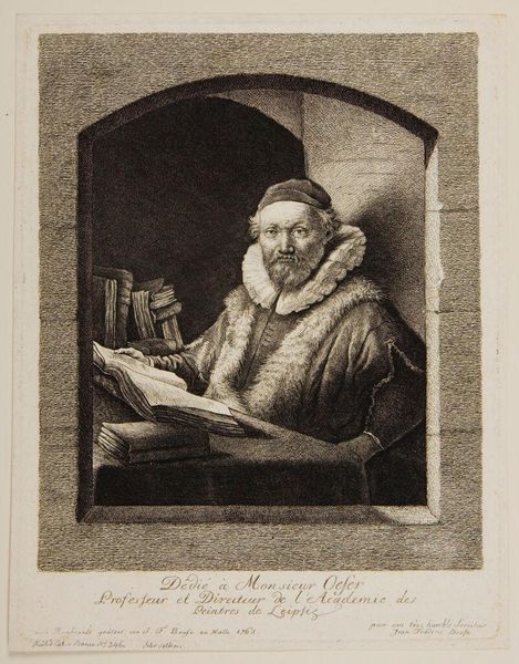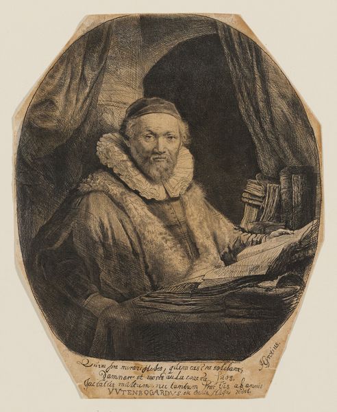 Curator: Rembrandt van Rijn's print, depicting Jan Uytenbogaert, a preacher of the Remonstrants, at his desk presents a fascinating study. Editor: It's certainly intense. The textures—the fur, the paper, the sheer number of books—all painstakingly rendered, convey a sense of industriousness and scholarly weight. Curator: Uytenbogaert's position is intriguing because it reflects a moment of relative tolerance amidst religious conflict. The Remonstrants advocated for more liberal interpretations of Calvinist doctrine. Editor: I am struck by the materials Rembrandt employs to construct this image, and how such a detailed and lifelike portrait could be achieved through the labor-intensive process of etching. Curator: Absolutely, and the image functions as both a portrait and a statement about the role of religious figures in shaping intellectual discourse. Editor: To consider the tools, the inks, the paper sourced and prepared by artisans—this lends the image itself a kind of sacred significance beyond its subject. Curator: Indeed, it's a potent reminder of the complex intersection of faith, politics, and personal identity in Rembrandt's time. Editor: Looking closely at the materiality of this etching truly opens it up, doesn't it?