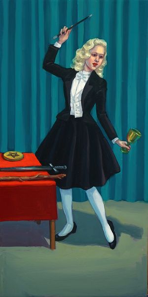 Zoe Hawk made this "King of Pentacles" painting in the 20th Century, and it really gets me thinking about the process of painting and how we play with signs and symbols. I like how the paint is applied thinly and smoothly here. It almost feels like a stage set itself, complete with the red curtains, and the figure like an actor who has stepped out of a painting by Balthus. I find the way Hawk combines the mundane with the symbolic intriguing. The flat planes of color feel contemporary, but it is as though the scene is set in another time. Look at the mustache! It’s so obviously fake, like a child playing dress-up, but it adds to this feeling of ambiguity. Is she a king or isn’t she? This kind of playful challenge to fixed ideas reminds me of Magritte and his absurd juxtapositions. The painting invites us to question what we think we know, embracing the endless possibilities of interpretation.