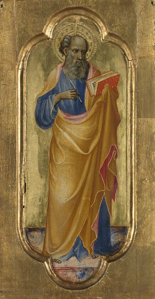 Curator: Standing before us is Spinello Aretino’s “Saint Philip,” tempera on wood, dating from 1384 to 1385. Editor: It possesses an unexpected tenderness. The soft palette and the saint’s downcast gaze create an intimate devotional space, almost separate from the rigid frame and gilded background. Curator: Yes, observe how Aretino employs the pointed arch and elaborate gold leaf details – stylistic hallmarks of the late medieval period. However, his composition introduces nascent Renaissance elements. Note the modeling of Philip's face, a departure from purely stylized representation. Editor: The book in Philip's hands—the Gospel, I presume—anchors him in his symbolic role, while that subtly off-center halo speaks to divine imperfection. Gold, the metal of divinity, frames his sanctity. Curator: Indeed. The limited colour palette--mostly reds and golds with restrained green—highlights the work’s inherent geometry. See how vertical lines emphasize the figure's stature, countered by the gentle curve of his shoulders. Aretino consciously guides the eye. Editor: And that inscription—S. Philippus S.— further contextualizes the image for a contemporary audience. This artwork serves as a devotional icon. Imagine how worshippers then might’ve perceived Philip as both an archetype and relatable figure. Curator: His quiet solemnity perhaps reflects the anxieties and spiritual focus of the period— a counterpoint to the upheavals of the late Middle Ages. His verticality and slender pose suggest he’s above temporal troubles, while still present within it. Editor: Ultimately, it reveals that religious icons aren't simply didactic symbols but carriers of powerful psychological resonance over centuries. Aretino successfully captures this idea. Curator: Precisely, “Saint Philip” epitomizes a liminal moment in art history where linear geometric representation and devotional portraiture exist in visual dialogue. Editor: A captivating exploration bridging materiality and spiritual import!