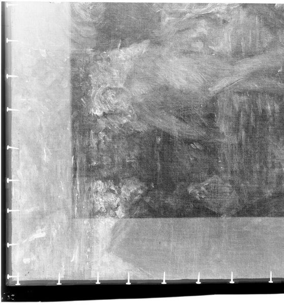 Editor: This is an X-radiograph of "The Days of Creation: the Sixth Day" by Edward Burne-Jones, housed here at the Harvard Art Museums. It's fascinating to see the layers beneath the surface. What can we learn from this perspective? Curator: Indeed, the x-ray reveals the underpainting and compositional changes, exposing the artist's process. Do you notice the recurring motifs that resonate with themes of creation, such as the figures and celestial symbols? How might those shapes, almost primordial, connect with the emotional resonance of the original artwork? Editor: I see the angels more clearly, it adds a layer of depth. Knowing the history behind the imagery adds a new level of interpretation. Curator: Precisely, the ability to deconstruct the images through this technique, and the cultural memories they evoke, helps us see the artwork anew.