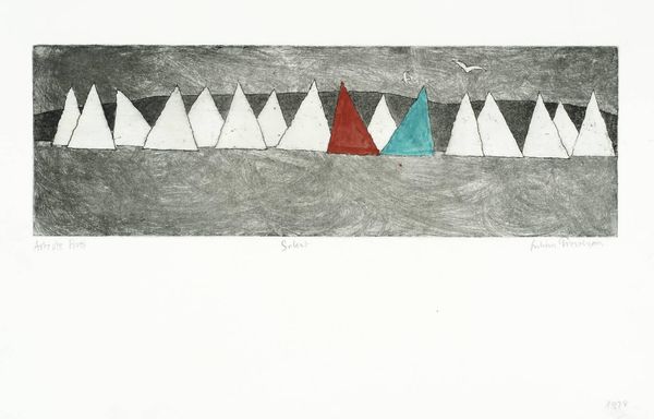 Editor: Here we have Julian Trevelyan's "Spinnakers." I find its bold, almost childlike shapes and the slightly unsettling atmosphere really captivating. What do you see in this piece? Curator: Trevelyan often blended reality and dream, didn't he? For me, the print evokes a sense of playful yet slightly ominous adventure. The choppy sea and the striped sails—are they signals, warnings, or simply joyous bursts of colour? I wonder! Editor: It does feel like something is lurking just beneath the surface. Thanks, that’s really insightful. Curator: Isn't it wonderful how a simple image can stir such depths? It makes you want to set sail!