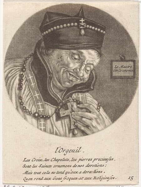 Curator: So, here we have “Luiheid,” or “Laziness,” an engraving by Jacob Gole, dating from possibly 1670 to 1724. It’s held at the Rijksmuseum. Editor: It's striking, in a grotesque way. I'm particularly drawn to the figure's exaggerated features and the sort of cynical humour. What's your interpretation of the work? Curator: I see this engraving as a commentary on social values and perhaps even a critique of power structures of the time. Look at how laziness is personified, not as some neutral state, but as an almost monstrous figure weighed down by their own…inertia. Editor: He almost seems monastic, but with the bell, clochette, attached to his head? And isn’t “Le Frere Morphée,” written on the tag? Curator: Precisely. This interplay suggests a critique of the clergy perhaps, hinting at hypocrisy or a life of ease within the church. And what does it mean to name this figure after Morpheus, the god of dreams? What kind of dream state does absolute laziness allow? Who profits from it, who is hurt by it? Editor: I guess I was mostly reacting to it aesthetically. I hadn’t really thought about it as a commentary. Curator: Well, art doesn't exist in a vacuum. This piece can serve as a lens through which we understand social attitudes towards work, class, and even moral responsibility in 17th- and 18th-century society, which perhaps can resonate even today. Editor: Thanks, I'll certainly view works differently now, understanding their place in a historical conversation. Curator: And I am grateful for the reminder that humour is itself a kind of social commentary!
