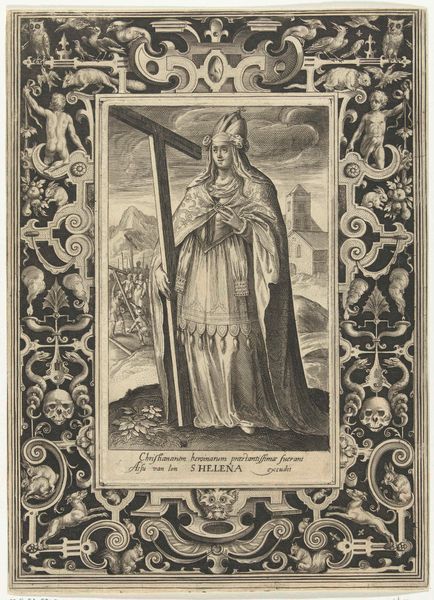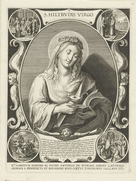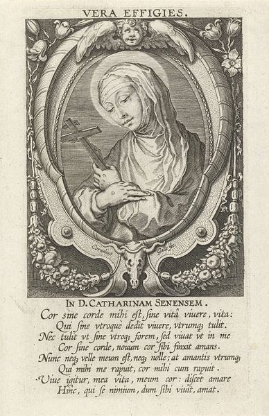 Editor: Here we have a print of H. Catharina van Siena, dating back to sometime between 1595 and 1633, currently held at the Rijksmuseum. It's attributed to Wierix, done with engraving, and has such a solemn and reverent quality. What strikes you when you look at it? Curator: The visual language of this piece is profoundly steeped in the symbolic traditions of the Church. Do you see the crown of thorns, the stigmata? They are potent signifiers of suffering and identification with Christ. Wierix invites us to consider how Catherine embodies a continuity of faith through visual metaphor. Editor: So, it's not just a portrait; it's about her connection to religious symbolism. Curator: Precisely. Notice also the dove, representing the Holy Spirit, placed above her head. What emotional effect do you think these repeated symbols created for viewers? How would they reinforce certain spiritual understandings? Editor: It creates an immediate, powerful visual connection between Catherine, the Holy Spirit, and Christ’s sacrifice, emphasizing her holiness. Curator: Yes! This is Northern Renaissance symbolism functioning at its most articulate: using well-established images to evoke centuries of doctrine. How does that help us understand the cultural memory at play here? Editor: It feels like this piece works to insert her into an ongoing visual tradition, reaffirming established religious ideas, instead of forging a totally new visual path. Curator: Indeed. The imagery anchors her, and us, in a long stream of religious thought, connecting the personal to the universal. I see in her humility and direct, open gaze, she becomes a part of the story for all who look at the engraving. Editor: That really deepens my appreciation – seeing how the symbols function as links in a cultural and historical chain. Thanks for shedding light on it!