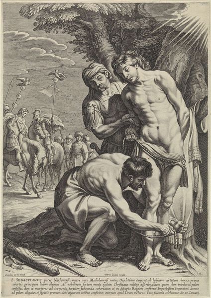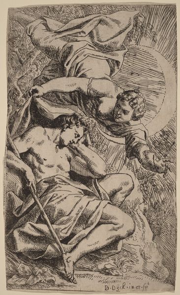 Pieter Schenk rendered this engraving, Venus weerhoudt Adonis van de jacht, sometime between 1660 and 1711. Here, Adonis is being held back from the hunt by Venus, a scene brimming with symbolic tensions. Consider Venus's gesture, a motif echoed through art history. We see similar restraining embraces in depictions of Lot and his daughters, or even Mary holding Christ. These gestures carry a weight of protection, but also potential conflict and restraint. The inherent dichotomy is evident in the conflicting desires of love and destiny. Adonis, with his hunting spear, embodies youthful vigor, but Venus's grip speaks to the eternal struggle between pleasure and fate. Such iconography is a cultural echo, reminding us of the cyclical nature of human experience.