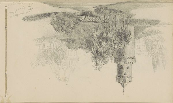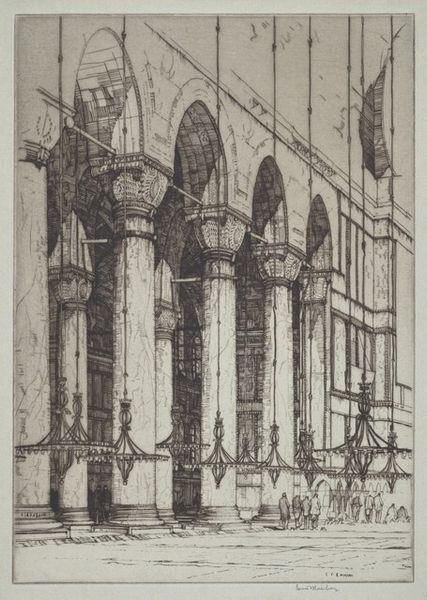 Curator: This is William Vaughn Moody’s drawing "Cathedral Entrance, Mexico," created around 1936, rendered in pencil and pen. What's your immediate reaction? Editor: It’s interesting, a real sense of quiet observation. Despite the grandeur implied by 'cathedral,' there's an everyday feeling about the sketch, almost as if we're looking at a snapshot of ordinary life unfolding around this impressive structure. Curator: Exactly! Moody seems interested in portraying the relationship between power structures, both literal and symbolic, and the lives of the people who inhabit their shadows. The cathedral, of course, a major statement of colonial religious influence, becomes the backdrop. Editor: And the presence of the indigenous people walking and standing around... do you think he captures anything specific regarding Mexico's history with colonialism through the scale of the cathedral in relation to the townspeople? Curator: That's definitely an avenue to explore. The imposing architectural dominance against the small figures creates a powerful dynamic. Also, consider the medium, pencil and pen – a method of immediate record keeping, perfect for documentary or journalistic work. What kind of message about Mexico might Moody, as a privileged tourist, send home about Mexico through a choice of these humble, yet functional materials? Editor: That makes me consider class and privilege in artmaking, especially as pertains to the depiction of cityscapes and globalism through tourism. Think about how access is implicit, but also a lens through which the Western gaze may alter perceptions in how urban planning intersects socio-economic structures. Is there a social hierarchy being expressed even through architectural forms alone? Curator: I think that framing the cathedral as more than just religious architecture and viewing it instead as a point of political discourse in post-colonial Mexico creates a fresh conversation on Moody's place in this legacy. Editor: For sure. I am looking forward to continuing our conversation. Curator: Agreed, let's dig deeper next time!